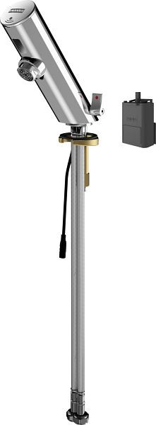 F3E-Mix Standbatterie DN 15 für Waschanlagen, opto-elektronisch gesteuert. Zum Anschluss an Warm- und Kaltwasser mittels Schläuchen mit integrierten Rückflussverhinderern und Sieben. Steuerelektronik, Magnetventilkartusche und Sensor im Ganzmetallgehäuse, Messing poliert verchromt, mit Temperaturwahlhebel und einstellbarem, verdrehsicherem Temperaturanschlag. Luftsprudler mit integriertem Durchflussmengenregler 3,0 l/min. Aktivierte Hygienespülung 24 Stunden nach letzter Betätigung, Sicherheitsabschaltung bei Dauerreflexion und Speicherung von Statistikdaten. Mit Möglichkeit der Parametrierung und Kommunikation über optionale bidirektionale Fernbedienung. Mit Batteriefach inklusive 6 V Lithium Batterie (CR-P2) zur Montage unterhalb des Waschtisches.