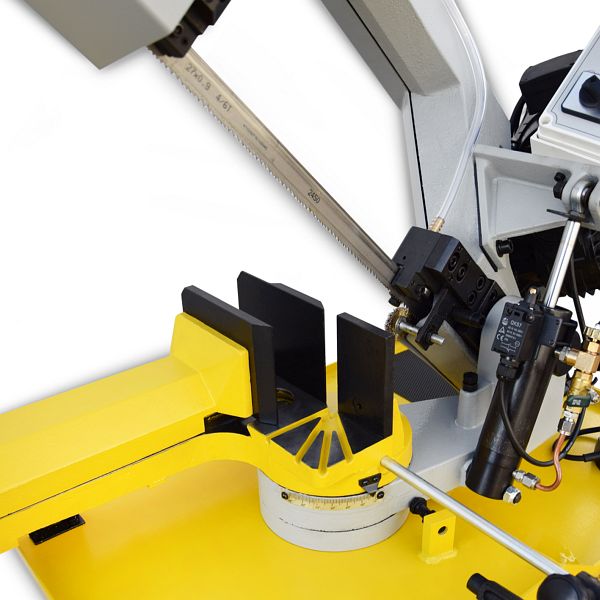 Die BAMATO Metallbandsäge BMS-275 ist eine präzise Maschine in massiver Gussausführung. Ein kraftvoller Getriebeantrieb und 2 Geschwindigkeiten sind weitere Highlights. Die integrierte Kühlmitteleinrichtung sowie die stufenlose, hydraulische Absenkung des Sägebügels sorgen für perfekte Schnittergebnisse. Für optimalen Bedienkomfort verfügt das Sägeaggregat ein Manometer zur Anzeige der Bandspannung, ist bis 60° schwenkbar und mit einer automatischen Endabschaltung ausgestattet.