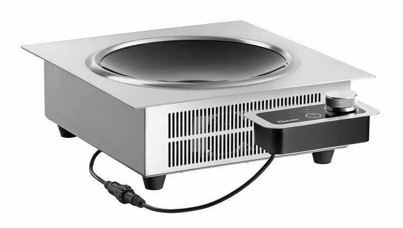 Der Einbau-Induktionswok lässt sich in Tisch- und Arbeitsplatten integrieren und bietet damit eine optimale Arbeitshöhe. Das separate Bedienfeld ermöglicht eine stufenlose Reglung von 60 bis 240°C. Alternativ stehen 10 Leistungsstufen zur Wahl.