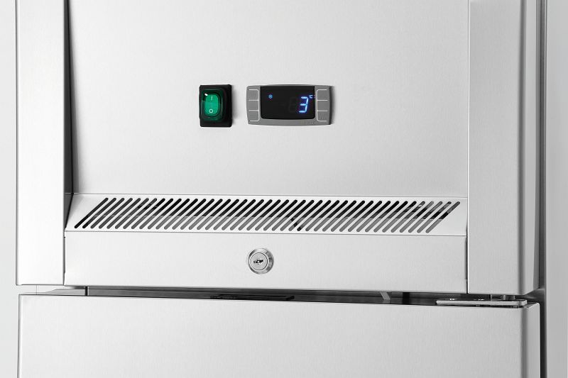 Der Gastronorm-Kühlschrank mit 4 Lenkrollen ist durch den Längseinschub besonders platzsparend. In den höhenverstellbaren Einschüben finden vorbereitete GN-Behälter in 1/1 und 1/2 GN ihren Platz.