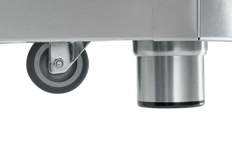 Sauberkeit an jedem Ort: Das mobile Spülcenter verwandelt sich dank Lenkrollen und höhenverstellbaren Füßen im Nu von einer mobilen zur standsicheren Hygienestation. Mit einer Aussparung für eine Geschirrspülmaschine, Waschbecken und Abtropffläche eine saubere Sache.