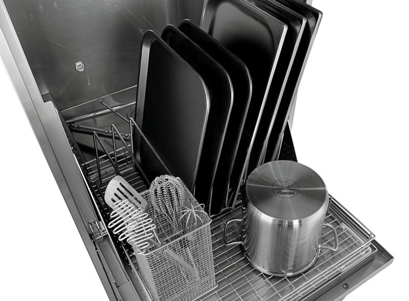 Die TS 665-1 R ist mit dem mitgelieferten Universalkorb und Tabletthalter für die Reinigung von sperrigen Spülgütern bestens geeignet. Sie sorgt für optimale Spülergebnisse bei Töpfen, Pfannen, Tabletts, Schüsseln und Schalen.