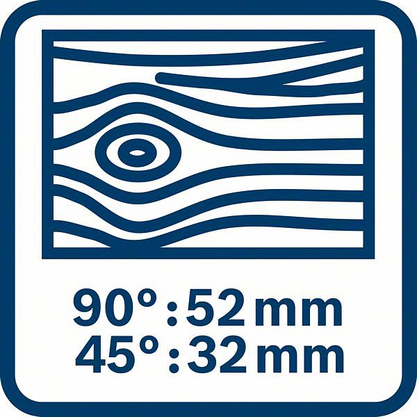 - Schnitttiefe ohne Führungsschiene 45°: 32 mm