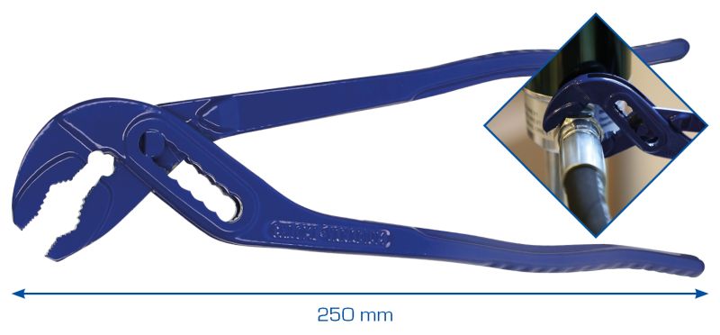 Für sicheres Greifen des Werkstücks sorgt eine selbstklemmende Verzahnung dank optimaler Maulgeometrie. Außerdem ist durch einen optimalen Drehpunkt ein geringerer Kraftaufwand notwendig. Die gezahnte Greiffläche sorgt für optimalen Halt am Werkstück. Die Wasserpumpenzange ist aus Spezial-Werkzeugstahl, geschmiedet und ölgehärtet.