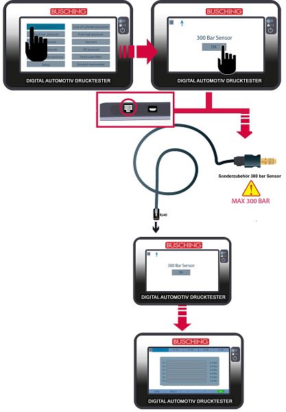 - ermöglichen sämtliche Druckprüfungen wie z.B. Öldruck, Turboladedruck, Kühlsystemdruck, AdBlue Druck, Kraftstoff Niederdruck, Unterdruck und Partikelfilterdruck, Common-Rail M12, 2000 bar Sensor usw durchzuführen