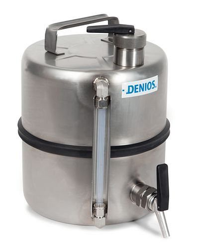 Edelstahlstandgefäß mit Füllstandsanzeige, 10 Liter Volumen, zum Verteilen und sicheren, leichten Dosieren von Gefahrstoffen, Behälter aus Edelstahl mit PTFE-Dichtung, explosionsgeschützt durch Überdruckventil und Flammendurchschlagsicherung, selbstschließender Zapfhahn, Mündung endet knapp oberhalb des Behälterbodens, mit Haltegriffen zum leichten Transport, inklusive gut ablesbarer Füllstandsanzeige.