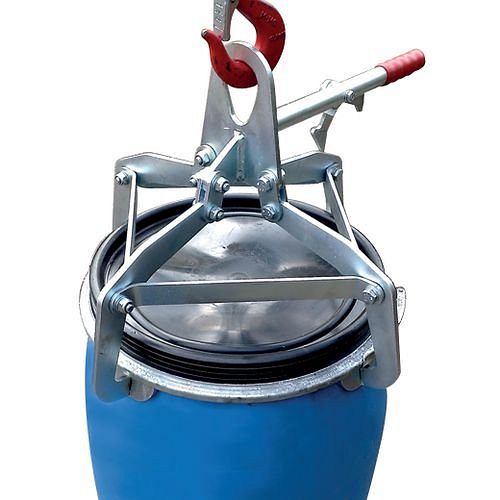 Spannklauengreifer für 120-Liter-Kunststoff-Deckelfässer, zum vertikalen Heben und Transportieren von 120-Liter-Kunststoff-Deckelfässern, einfache Einbaubedienung durch selbsteinrastende Sperrklinge, entriegeln durch Betätigung der Führungsstange, galvanisch verzinkt, für Fassdurchmesser: 395 mm.