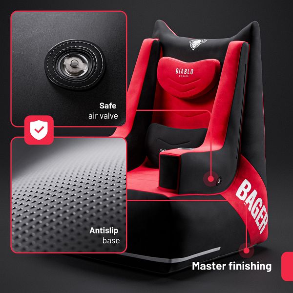 Der BAGER ist kein kurzfristiger Trend, sondern ein langlebiges und solides Upgrade des Komforts, der jedem Gamer viele Jahre lang dienen wird. Drei unabhängige Luftkammern, die mit einem hochwertigen Stoff überzogen sind, machen ihn besonders widerstandsfähig gegen Beschädigungen. Auf der Unterseite des BAGERs findest du ein rutschfestes Material, das für deine Sicherheit bei intensivem Spielen sorgt.