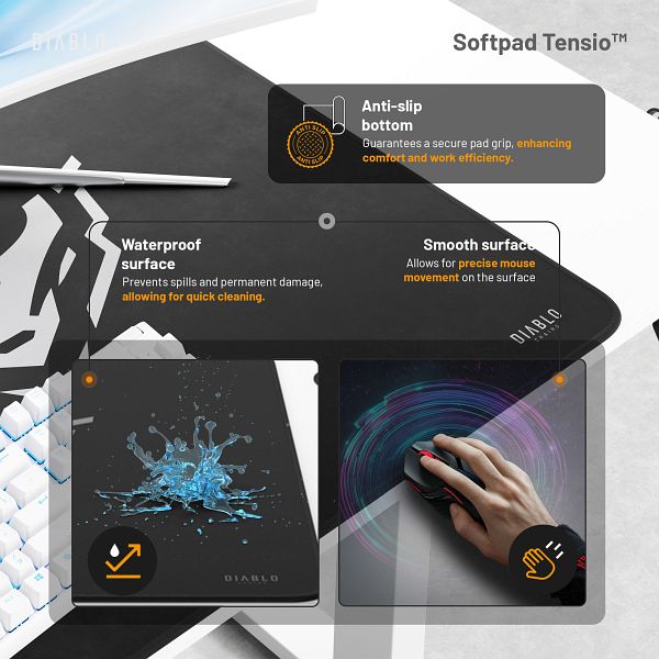 Die Tischplatte des Schreibtisches X-Tensio 1100 bietet viel Platz für alles, was du brauchst. Dank der kompakten Größe lässt sich der Tisch flexibel im Raum positionieren. Die mitgelieferte Diablo-Matte verleiht dem Setup einen besonderen Charakter, lässt die Maus leicht gleiten und ersetzt das Mauspad. Rutschfest und wasserabweisend sorgt sie für ein sauberes Setup.