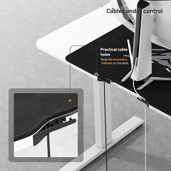- Zusatzfunktionen: Mauspad XL, Höhenverstellbar, Getränkehalter, Kopfhörerhalterung, Kabel-Organizer, Geteilter Schreibtisch