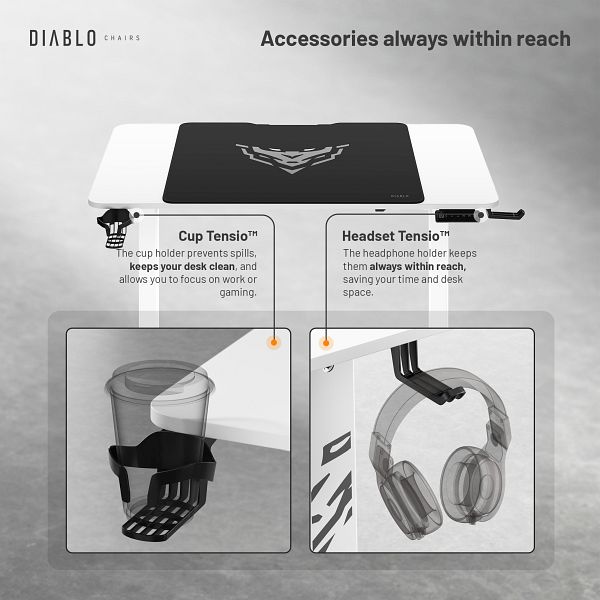 Der Diablo X-Tensio ist mit Halterungen für Becher und Kopfhörer ausgestattet. Dank den praktischen Lösungen hast du alles griffbereit, schützt deine Technik vor Missgeschicken und sparst Platz auf der Platte.