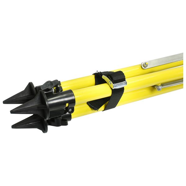 Die Stahlrohre sind galvanisch verzinkt bzw. in Warnfarbe gelb RAL 1012 lackiert. Im zusammengelegten Zustand kann das Stativ mittels eines unverlierbaren Spanngurtes verschnürt werden.