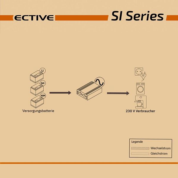 Die SI-Serie ist das solide Fundament der ECTIVE Wechselrichterfamilie. Sie bietet dir alle Funktionen, die du für den sicheren und zuverlässigen Betrieb benötigst ohne unnötige Extras. Dabei sorgt die reine Sinuswelle dafür, dass auch empfindliche Elektronik zuverlässig betrieben wird. Dank umfassender Schutzmechanismen bist du gegen Überspannung, Überlastung, Überhitzung, Unterspannung und Verpolung abgesichert. Mit ihrer kompakten Bauweise ist die SI-Serie überall einsatzbereit – vom Wohnmobil bis hin zur Werkstatt. Einfach anschließen und loslegen, genau dafür wurde sie entwickelt