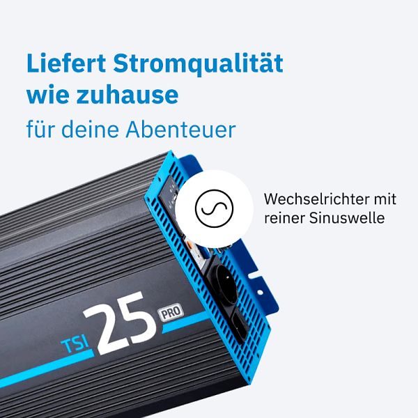 Der TSI PRO ist ein leistungsstarker Wechselrichter mit reiner Sinuswelle, der dir Stromqualität wie zuhause liefert. Dank integriertem FI/LS-Schutzschalter sind deine Geräte automatisch abgesichert – ganz ohne zusätzlichen Installationsaufwand. Mit der Netzvorrangschaltung schaltet der Inverter in Millisekunden zwischen Batterie- und Landstrombetrieb um und sorgt so für eine unterbrechungsfreie Versorgung. Die ARCTIC Markenlüfter arbeiten temperatur- und lastgesteuert, leise und zuverlässig, selbst bei hoher Dauerlast. Ob unterwegs im Wohnmobil, auf dem Boot oder im Offgrid-Setup: Die PRO Serie liefert dir sicheren, stabilen und komfortablen Strom.