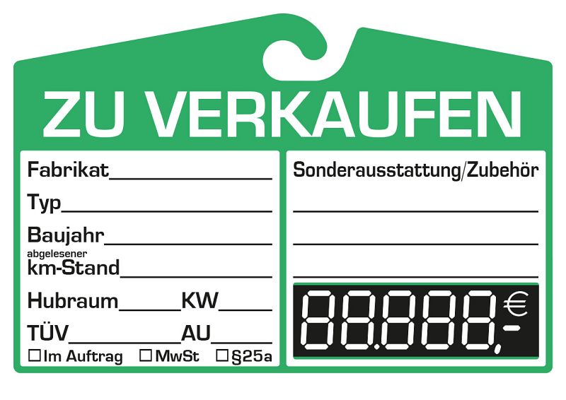 Eichner Verkaufsschild zur Befestigung am Innenspiegel, Grün, Preisfeld: digital, VE: 25 Stück, 9220-00101