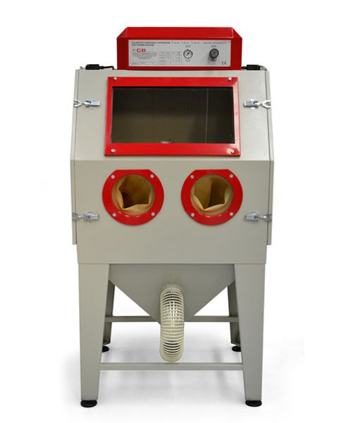 Max. Werkstückgröße ca. 50 x 70 x 50 cm, Zyklonabschneider für Strahlmittel-Wiedergewinnung, Mit Druckluft-Injektordüse P/3, Mit hoch belastbarer Wolframkarbid-Strahldüse, Sicherheits-Fußpedal (Start-Stop), Absaugventilator, Staubfiltersack, P/3 Injektor Ø 3 mm: 600 l/min LuftbedarfP/3 Injektor Ø 3,5 mm: 800 l/min LuftbedarfP/3 Injektor Ø 4 mm: 1.200 l/min Luftbedarf, P/4 Düsen-Ø: 6 / 8 / 10 mm, Staubdichte Abdeckung mit Schnellspannern, einfache Werkstückpositionierung