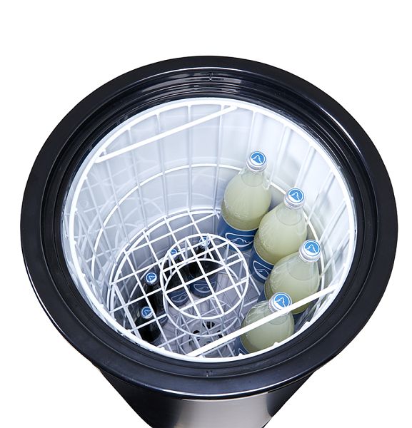 Werbekühlschrank für Getränke - voll mit Energie Die Form dieser KühlTonne lässt an einen Energy Drink denken. Und so ist es kaum verwunderlich, dass Getränkehersteller die Kühldose liebend gern als Werbekühlschrank einsetzen. Nachweislich werden mit dem länglich-runden Getränkekühler die Impulskäufe gesteigert. Die Getränke sind durch den transparenten Deckel sichtbar, ein flexibler Korb schafft Ordnung im Party-Cooler Innenleben. Für eine rasche und gleichmäßige Kühlung sorgt ein integrierter Ventilator. Der energievolle Getränkekühler steht auf vier Mobilitätsrädern, welche den Dosenkühlschrank flexibel machen. Der Transport ist damit erleichtert und ein schneller Ortswechsel, z.B. auf Events, jederzeit möglich. Die KühlTonne ist auch für 45 und 85 Liter erhältlich. Sie möchten den Party-Cooler mit Ihrem eigenen Werbedruck versehen? Kein Problem, bestellen Sie einfach ein Vollbranding dazu! Bei dem Party-Cooler handelt es sich um ein Gewerbekühlgerät, das nur gewerblich eingesetzt werden darf.