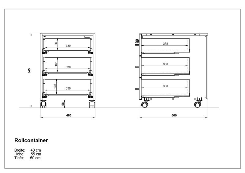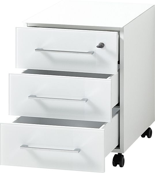 Rollcontainer mit drei Schubladen inkl. Selbsteinzug (jeweils belastbar bis zu 10 kg) - eine davon abschließbar; Oberboden belastbar bis zu 10 kg; Korpus in Weiß; drei verchromte Relinggriffe aus Metall, vier praktische Laufrollen - zwei davon mit Feststellbremse; Oberboden und Fronten mit Glasauflage, Weißglas, Einscheibensicherheitsglas, Melaminharzbeschichtung, hochwertige ABS-Kanten; Made in Germany.