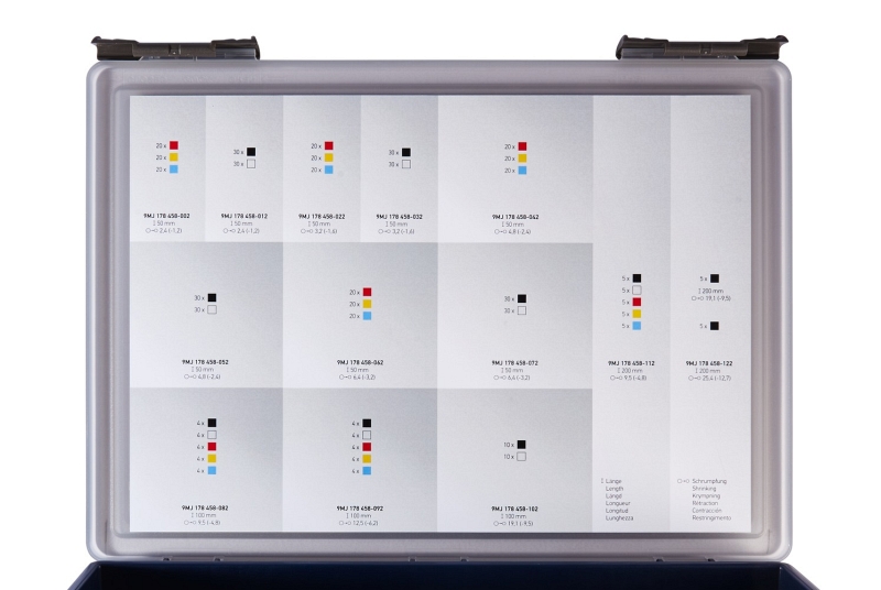 Die HELLA Sortimente enthalten eine Auswahl der jeweils gängigsten Produkte eines Themenbereichs – übersichtlich und kompakt in einem hochwertigen, voll transportfähigen Ordnungskonzept. Jeweils 4 Koffer lassen sich in die praktische Aufbewahrungsbox integrieren, die neben dem Transportgriff auch viele Befestigungsoptionen bietet. Inhalt: je 20x Farbe: rot/gelb/blau, Länge: 50mm, Durchmesser: 2,4mm (9MJ 178 458-002); je 30x Farbe: schwarz/transparent, Länge: 50mm, Durchmesser: 2,4mm (9MJ 178 458-012); je 20x Farbe: rot/gelb/blau, Länge: 50mm, Durchmesser: 3,2mm (9MJ 178 458-022); je 30x Farbe: schwarz/transparent, Länge: 50mm, Durchmesser: 3,2mm (9MJ 178 458-032); je 20x Farbe: rot/gelb/blau, Länge: 50mm, Durchmesser: 4,8mm (9MJ 178 458-042); je 30x Farbe: schwarz/transparent, Länge: 50mm, Durchmesser: 4,8mm (9MJ 178 458-052); je 20x Farbe: rot/gelb/blau, Länge: 50mm, Durchmesser: 6,4mm (9MJ 178 458-062); je 30x Farbe: schwarz/trans, Länge: 50mm, Durchmesser: 6,4mm (9MJ 178 458-072); je 4x Farbe: rot/gelb/blau/schwarz/transparent, Länge: 100mm, Durchmesser: 9,5mm (9MJ 178 458-082); je 4x Farbe: rot/gelb/blau/schwarz/transparent, Länge: 100mm, Durchmesser: 12,5mm (9MJ 178 458-092); je 10x Farbe: schwarz/transparent, Länge: 100mm, Durchmesser: 19,1mm (9MJ 178 458-102); je 5x Farbe: rot/gelb/blau/schwarz/trans, Länge: 100mm, Durchmesser: 9,5mm (9MJ 178 458-112); 10 x 200 Farbe: schwarz, Länge: 200mm, Durchmesser: je 5 x 19,1 25,4mm (9MJ 178 458-122)