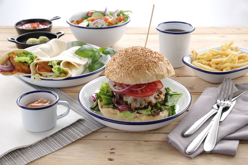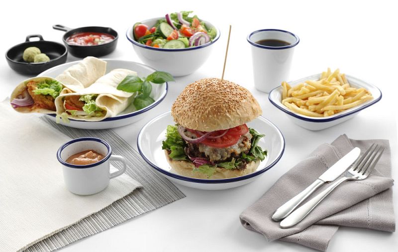 Weißer emaillierter Stahl mit einem schönen blauen Rand.
