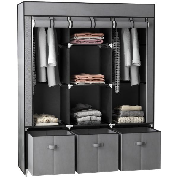 Mit diesem faltbaren Kleiderschrank aus Stoff von HOMCOM können Sie die Einfachheit in Ihrem Schlafzimmer in den Vordergrund stellen. Dank seiner praktischen und platzsparenden Eigenschaften können Sie den Schrank in Ihrem Schlafzimmer, Wohnzimmer oder an einem anderen Ort aufstellen. 5 offene Einlegeböden, 3 große Schubladen und 2 Hängeflächen bieten viel Platz für Ihre Kleidung. Der Bezug aus Vliesstoff hält Ihre Sachen staubfrei.