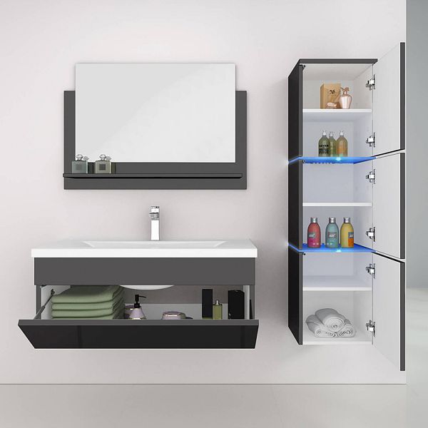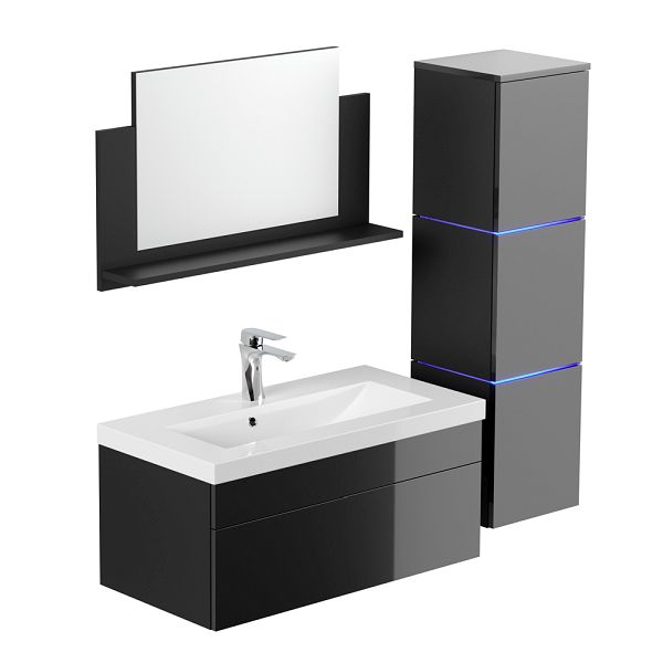 Werte dein Badezimmer auf mit diesem edlen Badezimmermöbel-Set. Unser Set, bestehend aus Spiegel, Waschbecken mit Waschbeckenunterschrank und einem Hängeschrank (links und rechts verwendbar), besticht durch ein modernes Design und verleiht deinem Badezimmer eine individuelle Note. Die Front des Unterschranks sowie die Front des Hängeschranks sind hochglanzlackiert und strahlen so eine außergewöhnliche Eleganz aus. Die Seiten sind matt melaminschwarz. Ein versiegelnder Schutzlack gewährleistet wasserabweisende und leicht zu pflegende Oberflächen. Die LED-Beleuchtung in dem Hängeschrank sorgt für ein stimmungsvolles Ambiente und einen modernen Look. Damit alle deine Utensilien einen festen Platz in deinem Badezimmer bekommen, bietet unser Badezimmermöbel-Set Wangerooge ausreichend Stauraum für eine perfekte Organisation. Zugunsten eines individuellen Ordnungssystems findest du in dem Hängeschrank drei separate Fächer und im Waschbeckenunterschrank eine Klappe, hinter der dir noch mehr Stauraum zur Verfügung steht. Außerdem findest du vor dem großen Spiegel eine weitere Ablagefläche
