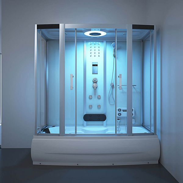 Dieses komplette Wellness-Erlebnis lässt dein Herz höherschlagen. Die Diamond BIG wurde eigens ergonomisch konzipiert, damit es überhaupt möglich ist, auf solch kleinstem Raum solch eine Ausstattung zu gewährleisten. Egal ob du duschst, badest (Whirlpool) oder saunierst, die Diamond BIG macht alles, egal in welcher Kombination, auf Knopfdruck möglich. Selbstverständlich ist auch der gewöhnliche Gebrauch über eine Handbrause, die über die befestigte Duschstange justierbar ist, möglich. Das moderne Design, gepaart mit guter Funktionalität, rundet unseren Topseller ab. Entspanne dich bei einem beruhigenden Whirlpoolgang unter dem blauen Deckenhimmel, lasse die Seele bei einem warmen Tropenregen baumeln oder verliere deinen Stress bei einem Dampfbad, optional auch mit Duftaroma. Das integrierte Ozon-Desinfektionssystem sorgt für rückstandslose, umweltfreundliche Reinigung. Der in der Wanne eingefasste Sitz und die Antirutschstruktur im Wannenboden gewährleisten den sicheren Gebrauch. Die integrierte Fußmassage für eine entspannte Reflexzonentherapie und die 8 Rückenmassagedüsen, die an der Mittelkonsole deinen Rücken massieren, machen das Entspannungserlebnis perfekt. Nicht nur die Eigenschaften sind herausragend, auch die Qualität ist für den angegebenen Preis mehr als fair. Hier zu erwähnen sind vor allem die 5 mm starke, weißgetönte ESG-Vollverglasung der "Diamond-Serie", sowie auch die Aluminium-Rahmenkonstruktion und das computergesteuerte Touch-Bedienelement. Die auf fast jeden Untergrund anzupassenden höhenverstellbaren Füße der Duschwanne machen dieses Produkt nahezu an jedem Ort montierbar.