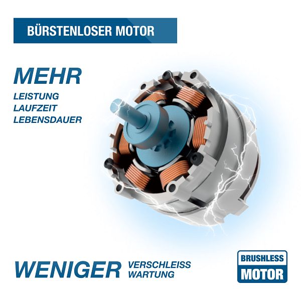 Der bürstenlose Motor steigert die Leistung um 25 % und sorgt gleichzeitig für eine bis zu zehnmal längere Lebensdauer. Dank geringerer Wärmeentwicklung profitieren Sie von einer um 50 % verlängerten Akku-Laufzeit und einem wartungsarmen Betrieb. Das Ergebnis ist eine hohe Energieeffizienz bei gleichzeitig reduziertem Verschleiß.