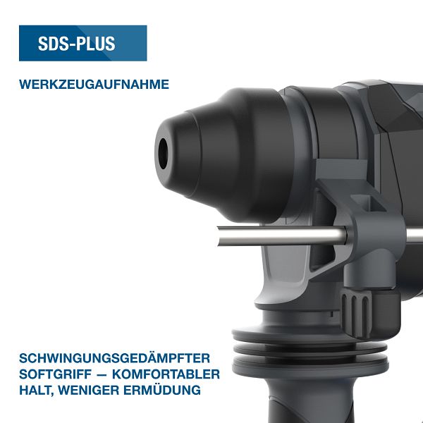 Das ergonomische Design und die ausgewogene Gewichtsverteilung sorgen für einen optimalen Halt in der Hand. Der gummierte Griff und das kompakte Gehäuse ermöglichen ein ermüdungsfreies Arbeiten, selbst über längere Zeiträume. Mit nur 2,8 kg ist der Akku-Bohrhammer besonders handlich und komfortabel in der Anwendung.