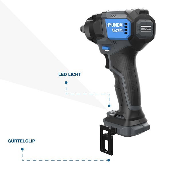 Der kompakte und handliche Hyundai Akku-Schlagschrauber ist nur 15 cm lang und wiegt lediglich 1.6 kg (inkl. 4.0Ah Akku). Mit ausgewogener Gewichtsverteilung und gummierten Griffen sorgt er für angenehmes, ermüdungsfreies Arbeiten, auch bei längeren Einsätzen oder in engen Räumen.