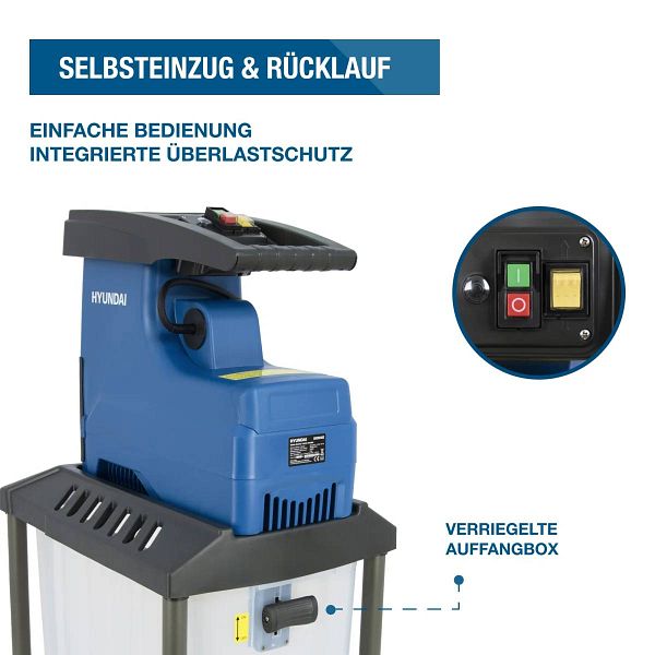 Dank innovativer Walzentechnologie bietet der HYUNDAI GH28045E einen Selbsteinzug und eine Rücklauf-Funktion, die den Gebrauch des Geräts erleichtern. Durch den Selbsteinzug wird das Schnittgut automatisch eingezogen und gleichmäßig zerkleinert, während die Rücklauffunktion Verstopfungen verhindert und einen durchgängigen Betrieb ermöglicht. So können Sie ohne lange Unterbrechungen effizient arbeiten.