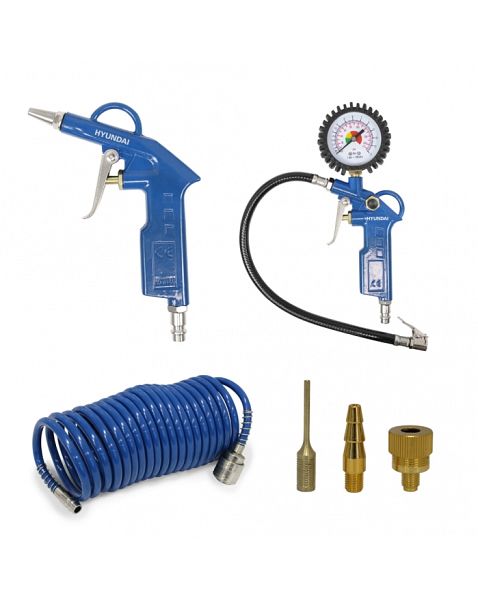 Das HYUNDAI Kompressor Zubehör SET ACZ55902 ist ein hochwertiges Set, das Werkzeuge für einfache Druckluftanwendungen bietet. Es ist kompatibel mit den meisten handelsüblichen Druckluftkompressoren. Die Werkzeuge eignen sich zur Kontrolle des Reifendrucks, zum Befüllen von Auto- und Fahrradreifen und zum präzisen Ausblasen. Der knicksichere Spiralschlauch mit Schnellkupplung ist ebenfalls Bestandteil des Sets.