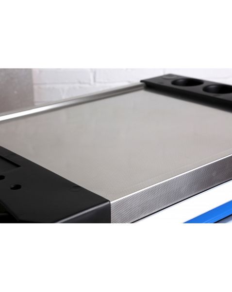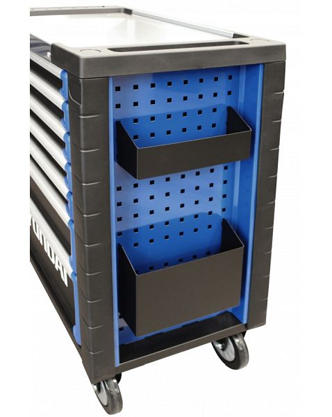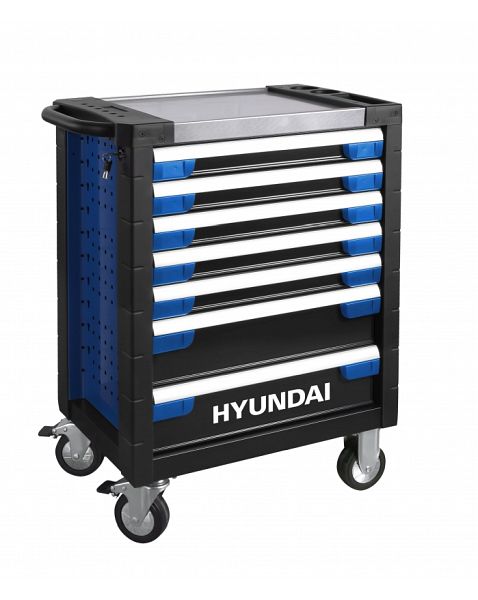 Der HYUNDAI Werkstattwagen ist aus stabilem, pulverbeschichtetem Stahl gefertigt. Kugelgelagerte Schubladen mit Zentralverriegelung sorgen für Struktur; Schaumstoffeinlagen ermöglichen eine benutzerfreundliche Anordnung des Werkzeugs. Der Wagen lässt sich am integrierten Griff leicht bewegen und die Massivräder können mit einer Feststellbremse fixiert werden.