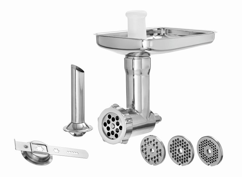 - Set bestehend aus: 1 Aufsatztablett, 1 Edelstahlmesser, 4-flügelig, 1 Spritzgebäckvorsatz, 1 Stopfer, 1 Wurstfüllhorn, 4 Lochscheiben (3 mm, 4,5 mm, 6 mm, 8 mm)