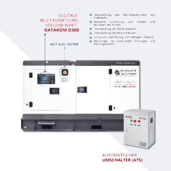 Alle Betriebsprozesse werden durch das moderne, multifunktionale digitale Steuergerät Datakom D300 überwacht und gesteuert. Der Controller erfasst sämtliche Betriebsparameter des Stromerzeugers, ermöglicht komfortable Einstellungen für den Start und den Betrieb der Anlage und überwacht den Batterieladestand sowie die Motordrehzahl. Zudem schützt er vor Überhitzung und niedrigem Ölstand, signalisiert mögliche Störungen und weist rechtzeitig auf erforderliche Wartungsarbeiten hin.