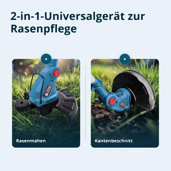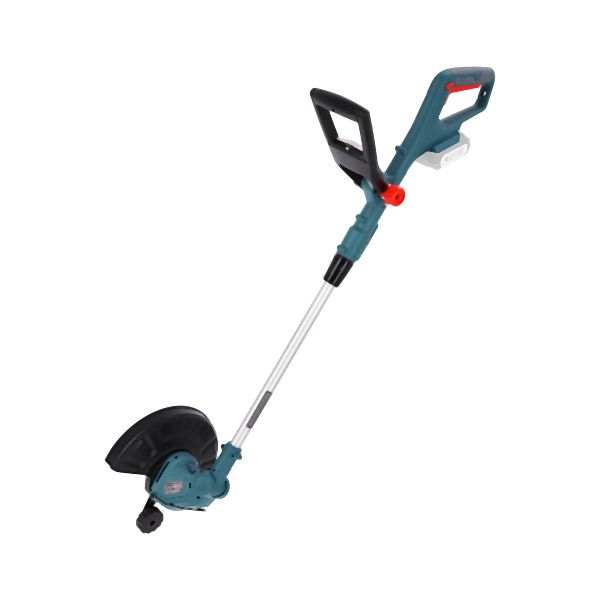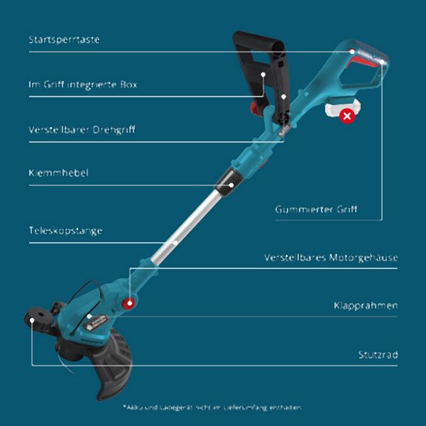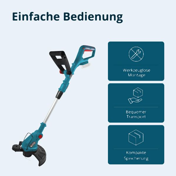 - Ausrüstung: Akku-Gartentrimmer, Messeraufbewahrungsbox, 2 x Spulen (eine bereits montiert), Schutzabdeckung, Führungsrad, Zusatzgriff, 4 x Kreuzschrauben