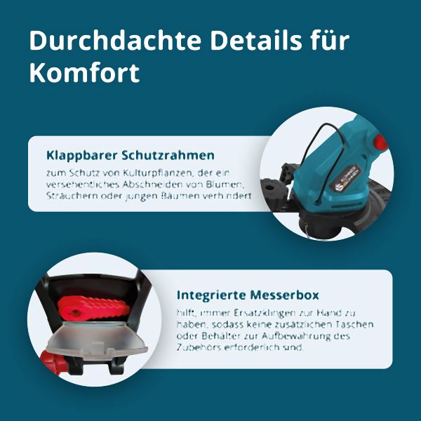- Klappbarer Pflanzenschutzbügel – Verhindert unbeabsichtigte Beschädigungen von Pflanzen während des Schneidens.