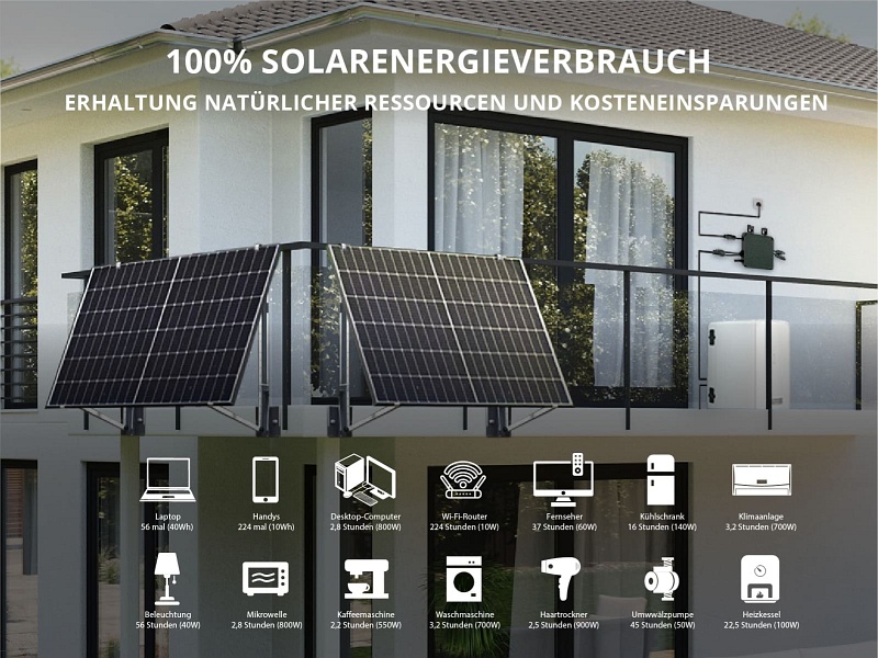 Balkon-Solarsysteme von Könner & Söhnen® sind eine fortschrittliche Lösung in der Balkonsystemserie, die erhebliche Einsparungen bei den Stromkosten ermöglicht, indem sie 100 % der Solarenergie nutzen. Basierend auf dem „Smart“ LiFePO4 Lithium-Eisen-Phosphat-Batterieblock mit Hochkapazitätsbatterien, hocheffiziente Solarmodule, und ein 800W Mikro-Wechselrichter. Der Einsatz von Speicherbatterieblöcken ermöglicht kostenlose Nutzung von Solarstrom während der Abendstunden oder an Tagen, an denen die Solarenergie nicht ausreicht. Mit dem Könner & Söhnen®-System gibt es keinen Energieverlust - Sie können ungenutzte Solarenergie im Batterieblock speichern und sie am Abend oder bei unzureichendem Sonnenlicht verbrauchen.