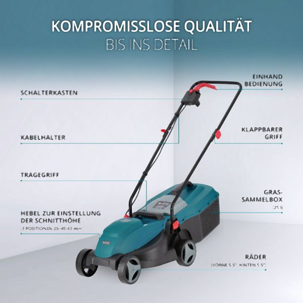 Könner & Söhnen® Elektro-Rasenmäher sind einfach aufgebaut, sodass die Vorbereitung für die Arbeit, die Wartung oder die Lagerung schnell, einfach und werkzeuglos erfolgen kann. Dies erleichtert dem Benutzer den Umgang mit dem Gerät und spart Zeit und Mühe.