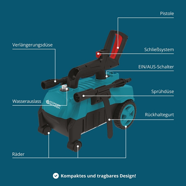 Der Hochdruckreiniger hat kompakte Maße, was einen einfachen Transport und eine platzsparende Lagerung ermöglicht. Das leichte Design und die ergonomische Form sorgen für komfortable Handhabung.