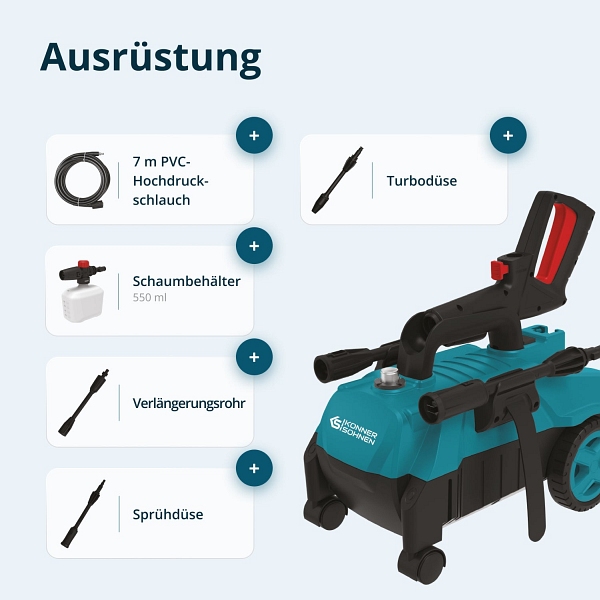 - Ausrüstung: Spritzpistole mit Schnellkupplung, Verlängerungsrohr, Verstellbare Düse, Rotordüse, 7 m Hochdruckschlauch, 5 m Netzkabel, 550 ml Schaumsprüher, Wasserfilter, Düsennadel zur Reinigung