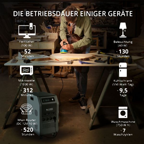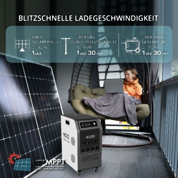 Eine vollständig autonome Powerstation, die einen leistungsstarken Wechselrichter, einen MPPT-Controller und eine große Batterie zur Energiespeicherung vereint. Dank der hohen Batteriekapazität und der starken Leistung des Wechselrichters können Sie viele Geräte über längere Zeit betreiben.