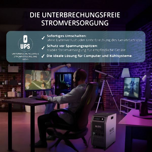 Die Powerstation gewährleistet eine kontinuierliche Stromversorgung angeschlossener Geräte, selbst bei Stromausfällen oder Spannungsschwankungen im Netz. Innerhalb von Millisekunden stellt die Station die Spannung für die Geräte bereit und schützt so vor Datenverlust, Beschädigung von Geräten und Unterbrechung von Arbeitsprozessen.