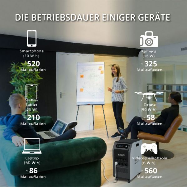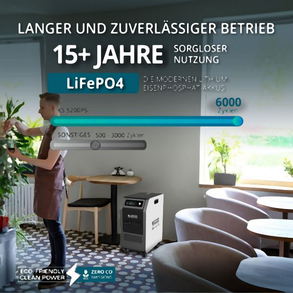 Die Powerstation ist mit Lithium-Eisen-Phosphat-Akkus (LiFePO4) ausgestattet und hält über 6000* Lade- und Entladezyklen stand, was einen stabilen Betrieb über viele Jahre gewährleistet.