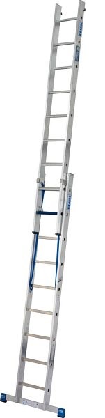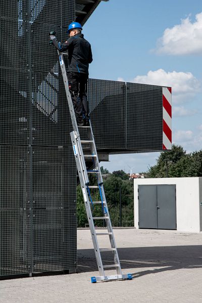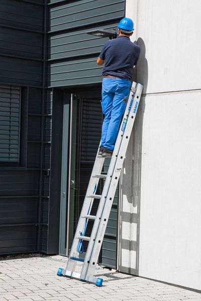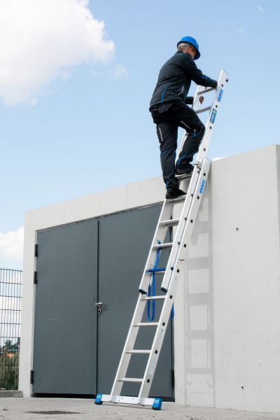 Leichte, zweiteilige, professionelle Aluminium-Mehrzweckleiter mit Stufen/Sprossen-Kombination für TRBS 2121-2-konforme Anwendung. Verwendbar als Anlege- und Schiebeleiter mit Quertraverse. Das Stufenleiternteil der Stehleiter kann ebenfalls als Arbeitsplatz verwendet werden. Durch die neue, innovative Stufen/Sprossen-Kombination in einer Leiter kann diese, je nach Aufstellart, als Verkehrsweg und als Arbeitsplatz verwendet werden.