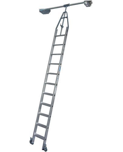 - Aluminium-Stufen-Regalleiter mit integriertem Kopffahrwerk-System für Doppelregal, drehbar