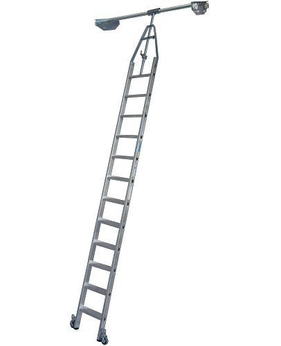 - Aluminium-Stufen-Regalleiter mit integriertem Kopffahrwerk-System für Doppelregal, drehbar