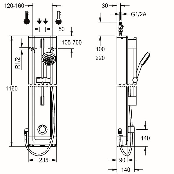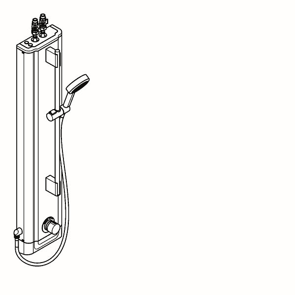 F5S-Mix Duschpaneel aus Edelstahl für Aufputzmontage mit Selbstschluss-Eingriffmischer DN 15 und Handbrausegarnitur. FRAMIC Selbstschluss-Mischkartusche, hydraulisch gesteuert, wartungsarm und stagnationsfrei, mit Keramikscheibentechnik, selbsttätig schließend, fl ieß druckunabhängig durch mediengetrennte Bauart. Fließzeit stufenlos einstellbar. Mit einstellbarem und verdrehsicherem Temperaturanschlag. Zum Anschluss an Warm- und Kaltwasser. Ganzmetallausführung, sichtbare Teile poliert verchromt. Vormontierte Brausestange, Messing verchromt, mit höhenverstellbarem Handbrausehalter sowie Handbrause Kunststoff verchromt, Brauseboden mit Regenstrahl, Durchmesser 110 mm, Brauseschlauch 900 Gehäuse aus Edelstahl mit erhabener Funktionsfläche und Abdeckkappen aus Kunststoff für Anschlusss Schläuche mit absperrbaren Wassermengenregulierungen mit Rückflussverhinderer und Sieb.