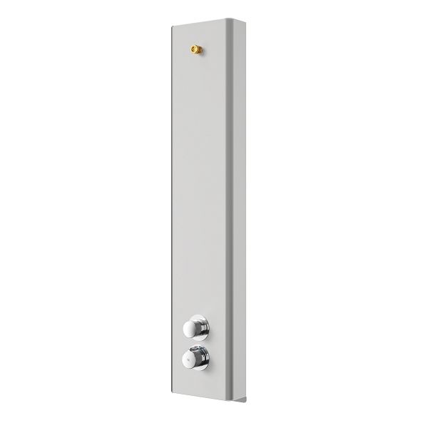F5S-Therm Duschpaneel aus Edelstahl für Aufputzmontage mit Selbstschluss-Thermostatbatterie DN 15 und Anschlussstutzen für Duschkopf. Speziell geeignet für Vandalismus gefährdete Einrichtungen. Hydraulisch gesteuert, zum Anschluss an Warm- und Kaltwasser von hinten. Funktionsblock mit integrierter FRAMIC Selbstschlusskartusche, Thermostat und Vorrichtung für Hygieneeinheit zur Durchführung einer automatischen Hygienespülung, programmgesteuerten thermischen Desinfektion (zusätzliche Bypass-Magnetventilkartusche notwendig) und Speicherung von Statistikdaten. FRAMIC Selbstschlusskartusche, wartungsarm und stagnationsfrei, mit Keramikscheibentechnik, selbsttätig schließend, fließdruckunabhängig durch mediengetrennte Bauart. Fließzeit stufenlos einstellbar. Thermostat mit Metallgriff mit einstellbarem und verdrehsicherem Temperaturanschlag und Möglichkeit zur Durchführung einer manuellen thermischen Desinfektion, sichtbare Teile poliert verchromt. Anschlussstutzen für separat notwendigen KWC Duschkopf DN 15 mit vormontiertem Durchflussmengenregler 9,0 l/min. Gehäuse aus Edelstahl, einteilig geschlossen inklusive Sicherheitsschrauben. Anschlussschläuche mit absperrbaren Wassermengenregulierungen mit Rückflussverhinderer und Sieb.