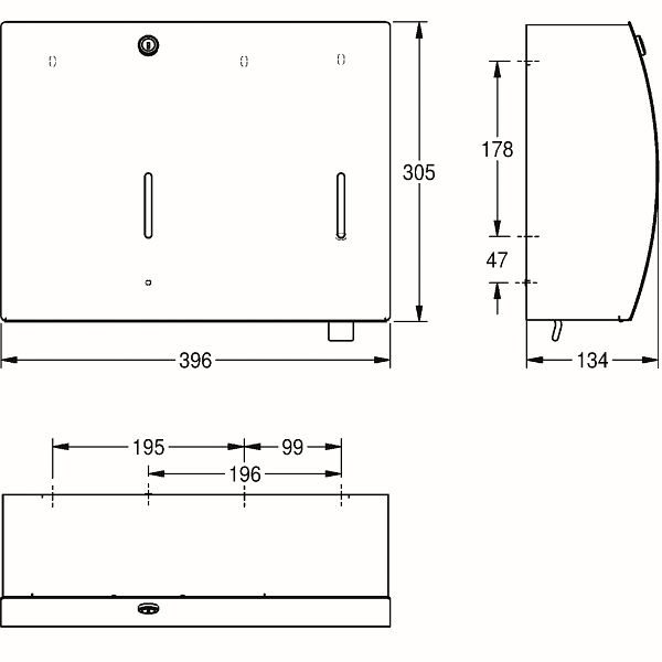 Papierhandtuchspender und Seifenspender Kombination, für Aufputzmontage, Chromnickelstahl, Oberfläche seidenmatt, Materialstärke 1,5 mm, Front mit InoxPlus Oberflächenveredelung zur Reduzierung von Fingerabdrücken und mit besseren Reinigungseigenschaften (easy to clean), gebogene Front mit zwei Sichtfenstern, Zylinderschloss mit KWC Einheitsschlüssel, Papierhandtuchspender mit Fassungsvermögen 300 400 Stück bei Papier mit Z-Faltung, Seifenspender geeignet für Flüssigseife und Lotionen, 0,8-Liter-Nachfüllbehälter, mit Kunststoffdrückerhebel, inklusive Edelstahlschrauben und Dübel.